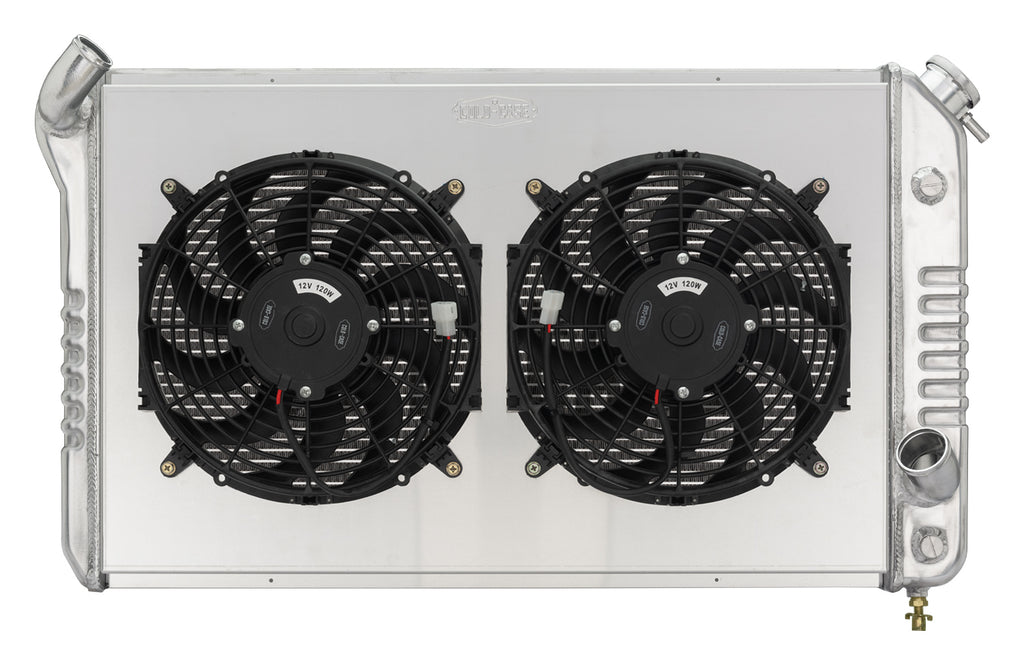 Radiator and Fan - 33.7 in W x 19 in H x 6.75 in D - Dual Fans - Driver Side Inlet - Passenger Side Outlet - Aluminum - Polished - Chevy Corvette 1973-76 - Kit