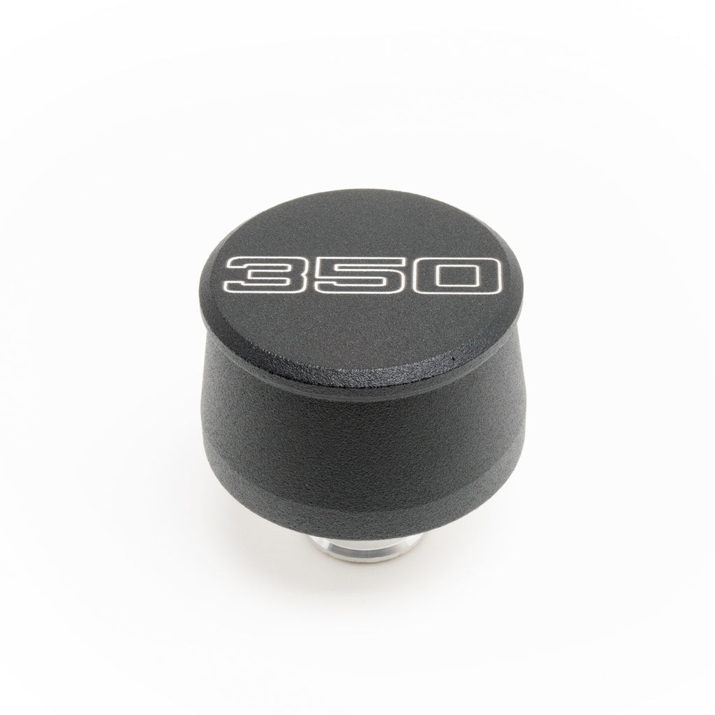 Breather - Push-In - Round - 1-1/4 in Hole - 350 Script Logo - Aluminum - Black Powder Coat - Each