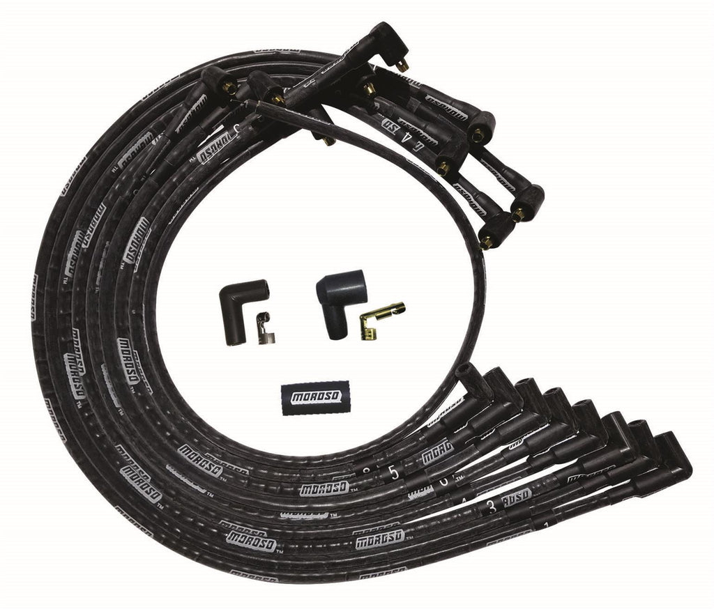 Spark Plug Wire Set - Ultra - Spiral Core - 8 mm - Sleeved - Black - 90 Degree Plug Boots - Socket Style - Under The Header - Small Block Chevy - Kit