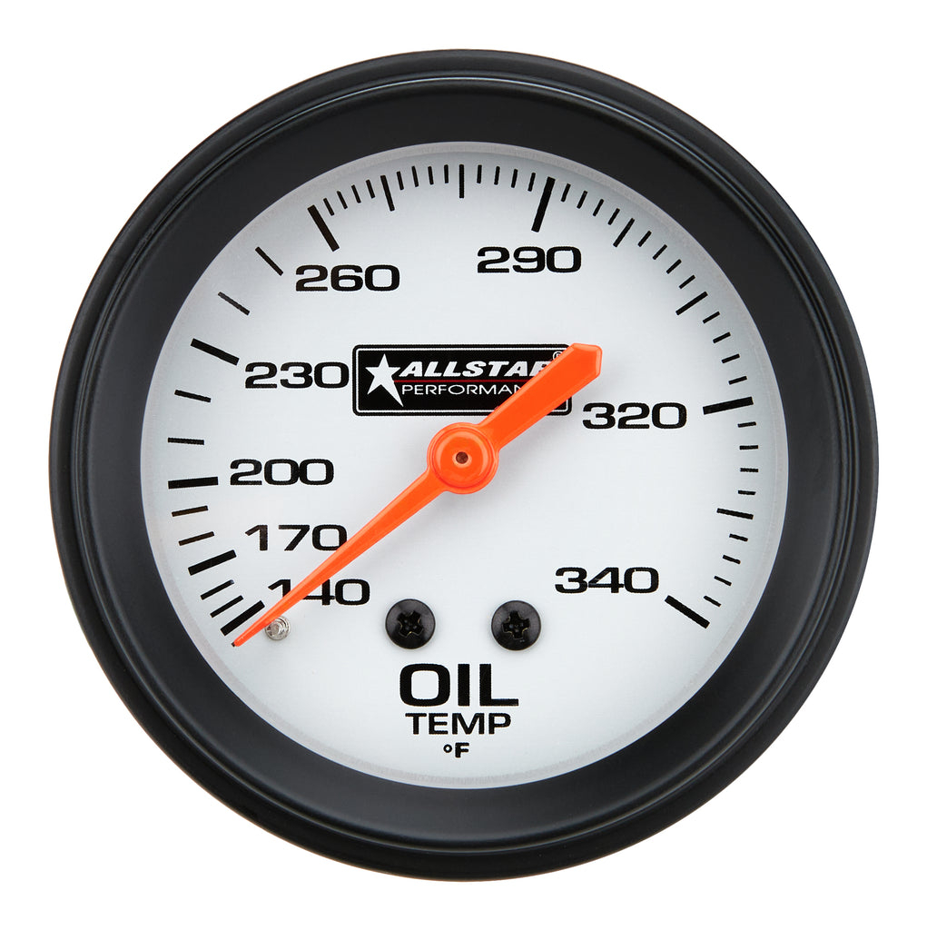 Oil Temperature Gauge - 140-340 Degree F - Mechanical - Analog - Full Sweep - 2-5/8 in Diameter - Silver Face - Each