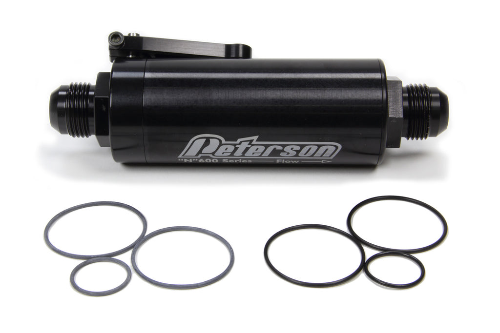 Fuel Filter - 600 Series - In-Line - 100 Micron - Stainless Element - 12 AN Male Inlet - 12 AN Male Outlet - Shut Off Valve - Aluminum - Black Anodized - Each