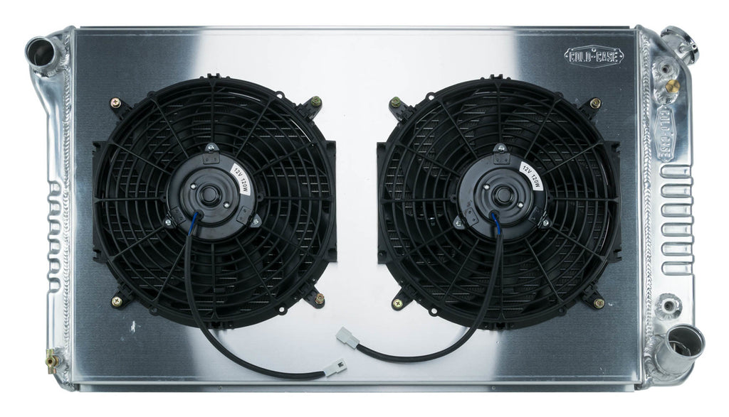Radiator and Fan - 34 in W x 18.6 in H x 3 in D - Dual Fans - Driver Side Inlet - Passenger Side Outlet - Aluminum - Polished - Automatic - GM Fullsize Truck 1967-76 - Kit